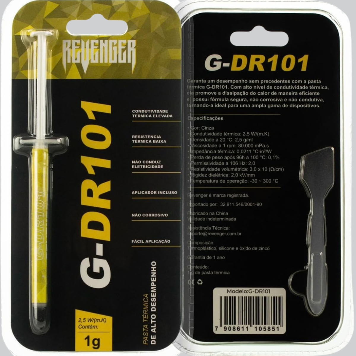 A Pasta Térmica REVENGER G-DR101 foi desenvolvida para garantir dissipação de calor eficiente e desempenho térmico estável em computadores, notebooks e dispositivos eletrônicos. Com condutividade térmica de 2,5 W/m·K, ela oferece excelente custo-benefício para manutenções, upgrades e montagens domésticas ou corporativas. Sua fórmula cinza de alta densidade é não condutiva e não corrosiva, garantindo total segurança durante a aplicação e protegendo os componentes contra curto-circuito. A textura viscosa facilita a aplicação uniforme, melhorando o contato térmico entre o processador e o dissipador. Além disso, sua ampla faixa de operação, de -30°C a +300°C, assegura confiabilidade mesmo em diferentes condições de uso.